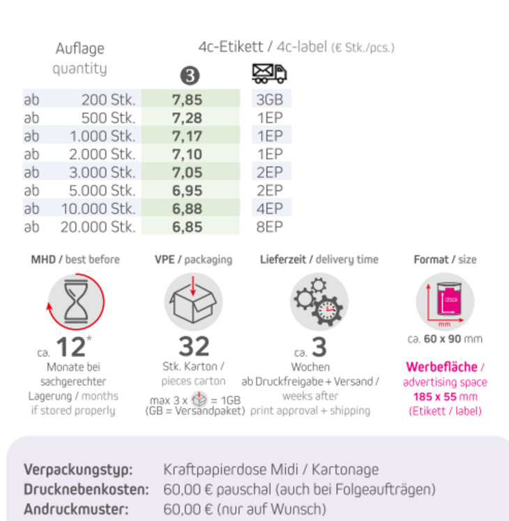 Inhalt: Bio Pfefferminz Drops 80gVerpackung: Biologisch abbaubare Eco Pappdose Midi / Kartonage braunFormat: ca. 60 x 90 mmDruck: 4c-Etikett Werbefläche: 185 x 55 mmLieferzeit: ca. 3 Wochen ab Druckfreigabe + VersandVPE: 32 Stk. / KartonHaltbarkeit: ca. 12 Monate bei sachgerechter LagerungMindestbestellmenge: 200 Stck.