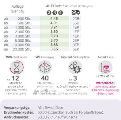 Inhalt: Bio Pfefferminz Drops 60gVerpackung: Mini Sweet DoseFormat: ca. 70 x 40 mmWerbefläche: 4c-Flügeletikett 119 x 65 mm Lieferzeit: ca. 3 Wochen ab Druckfreigabe + VersandVPE: 40 Stk. / KartonHaltbarkeit: ca. 12 Monate bei sachgerechter LagerungMindestbestellmenge: 200 Stück