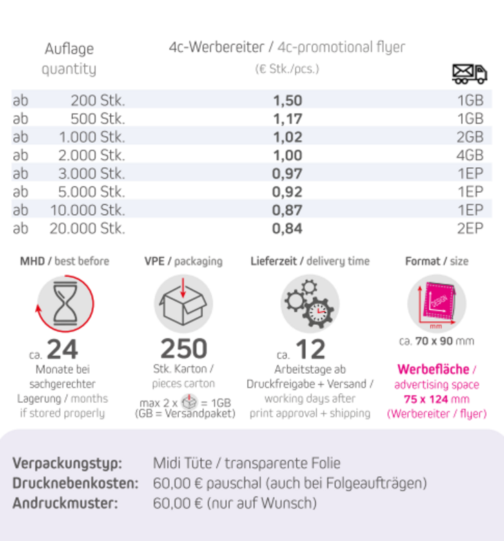 Produkt: Midi Tüte / transparente FolieInhalt: Vegane Pfefferminz Drops (zuckerfrei) 15gFormat: ca. 70 x 90 mmWerbefläche: 4c-Werbereiter 75 x 124 mmLieferzeit: ca. 12 Arbeitstage ab Druckfreigabe + VersandVPE: 250 Stk. / KartonHaltbarkeit: ca. 24 Monate bei sachgerechter LagerungMindestbestellmenge: 200 Stück