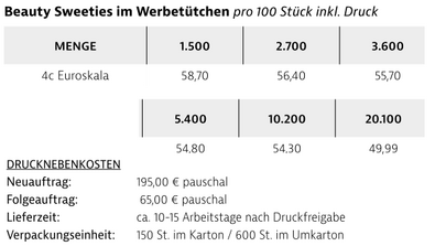 Die softigen Beauty Sweeties im individuell bedruckten Werbetütchen sind gluten-, fettfrei sowie frei von Konservierungsstoffen und künstlichen Farbstoffen.Gewicht: Inhalt ca. 16,4 gGeschmack: Himbeere/Brombeere, Apfel/Birne, Kirsche/Johannisbeere oder Zitrone/ErdbeereVerpackungsmaß: ca. 90 x 110 mmVerpackungseinheit: 150 St. im Karton / 600 St. im UmkartonVerpackung: Papier/PE und BIO-Folie verfügbar Nachhaltig verpacken + 1,30 EUR Aufpreis je 100 StückHaltbarkeit: ca. 12 Monate bei sachgerechter LagerungLieferzeit: ca. 10-15 Arbeitstage nach DruckfreigabeMindestbestellmenge: 1.500 Stück