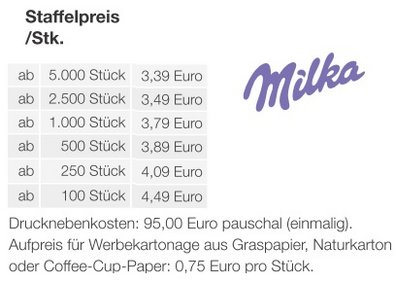 Preisliste 3D Präsent Container Milka Alpenmilch Schokoladenmischung