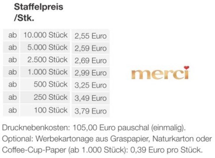 Auffällig und individuell! Mit dem beliebten 3D Präsent „Haus“ setzen Sie Ihre Werbebotschaft optimal in Szene. Ein Geschenk das bestimmt einen Ehrenplatz in den Büros Ihrer Kunden findetProduktdetails: Individuelle Präsentverpackung aus hochwertiger Kartonage mit süßer Füllung. Inhalt : 10 Stück Merci Petits ca. 58gNachhaltigkeit: Für jede Bestellung mit uns wird ein Baum über GROW MY TREE gepflanzt. Wir verwenden FSC ® -zertifizierten Karton aus nachhaltiger Forstwirtschaft und anderen kontrollierten QuellenMaße: ca. 107 x 57 x 57 mmBedruckung/Motive: 4-farbiger Druck auf grafischem Premium-Karton (FSC ® -zertifiziert). Optional auf Graspapier, Naturkarton oder Coffee-Cup-Paper.Haltbarkeit: 6 MonateLieferzeit/Zubehör: Lieferung ca. 15 Arbeitstage nach Druckfreigabe.Gleich mitbestellen: Stabiler Einzelkarton für den Postversand an Ihre Kunden: 0,59 Euro pro Stück.Mindestbestellmenge: 100 Stück