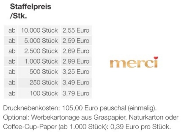 Originelles 3D-Präsent Schiff mit süßer Füllung: Die hochwertige Verpackung setzt Ihre Marke perfekt in Szene und sorgt für Aufmerksamkeit. Ideal für Reiseveranstalter, Logistikunternehmen oder als sympathisches Give-Away.Produktdetails: Individuelle Präsentverpackung aus hochwertiger Kartonage mit süßer Füllung. Inhalt : 10 Stück Merci Petits ca. 58gNachhaltigkeit: Für jede Bestellung mit uns wird ein Baum über GROW MY TREE gepflanzt. Wir verwenden FSC ® -zertifizierten Karton aus nachhaltiger Forstwirtschaft und anderen kontrollierten QuellenSchiff: ca. 180 x 56 x 50 mm Bedruckung/Motive: 4-farbiger Druck auf grafischem Premium-Karton (FSC ® -zertifiziert). Optional auf Graspapier, Naturkarton oder Coffee-Cup-Paper.Haltbarkeit: 6 MonateLieferzeit/Zubehör: Lieferung ca. 15 Arbeitstage nach Druckfreigabe.Gleich mitbestellen: Stabiler Einzelkarton für den Postversand an Ihre Kunden: 0,59 Euro pro Stück.Mindestbestellmenge: 100 Stück