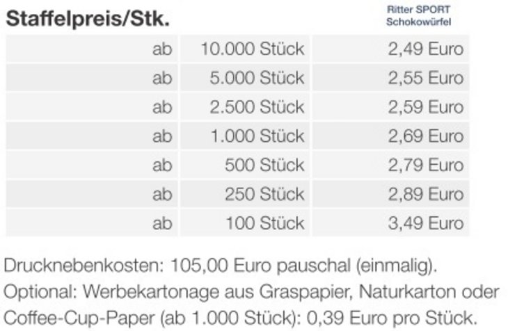 Preisliste Kissenverpackung Creative Ritter SPORT Schokowürfel mit Logo