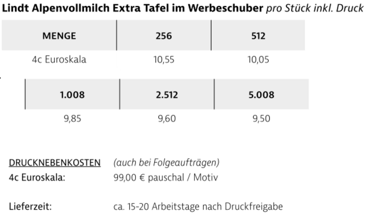 Preisliste Lindt Alpenvollmilch Extra Tafel im Werbeschuber mit Logo