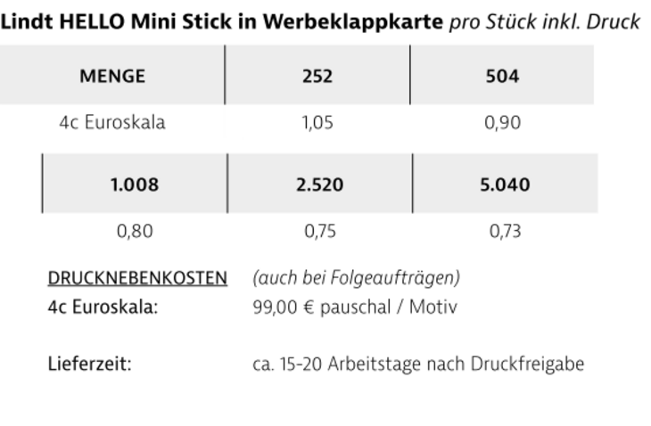 Die beliebten HELLO Mini Sticks werden in einer Werbeklappkarte aus FSC ® -zertifiziertem Karton angeboten.Inhalt: 1 St. / 10g Lindt HELLO Mini Sticks Geschmacksrichtung: Salted Caramel, Crunchy Nougat, Cookies & Gream oder Strawberry Cheesecake (Sortenrein oder gemischt möglich)Verpackungsmaß: ca. 68 x 88 x 13 mm (geschlossen)Druckart: 4c-EuroskalaVerpackungseinheit: 36 St. im Karton / 216 St. im UmkartonHaltbarkeit: ca. 9 Monate bei sachgerechter LagerungLieferzeit: ca. 15-20 Arbeitstage nach DruckfreigabeMindestbestellmenge: 252 Stück