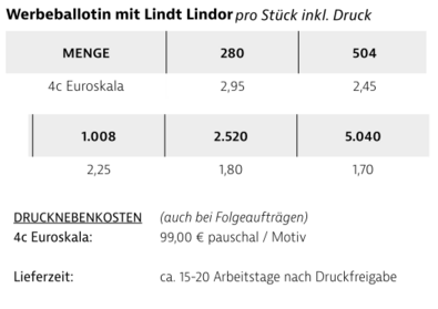 Preisliste Lindt Lindor Kugeln im Werbeballotin mit Logo