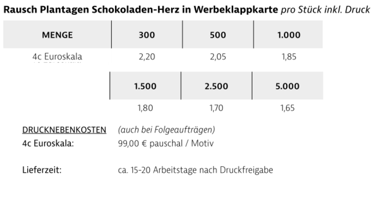 Preisliste Rausch Plantagen Schokoladen-Herz in Klappkarte groß veredelt mit Logo
