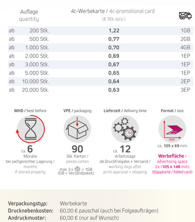 Inhalt: Schoko-Lamm 6gVerpackungstyp: WerbekarteFormat: ca. 105 x 69 mmWerbefläche: ca. 2 x (105 x 148 mm) - siehe StandskizzeLieferzeit: ca. 12 Arbeitstage ab Druckfreigabe + VersandDruckart: 4c-Werbekarte DigitaldruckHaltbarkeit: ca. 6 Monate bei sachgerechter LagerungVPE: 90 Stk / KartonMindestmenge: 200 Stk.