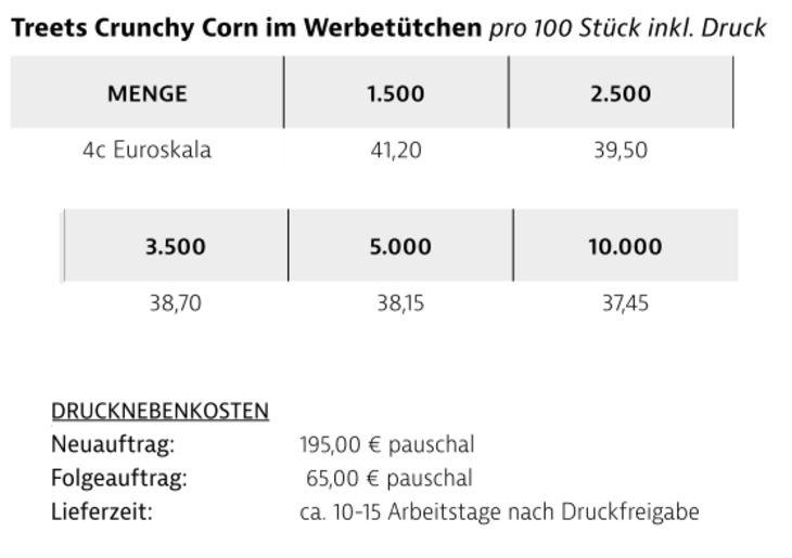 Preisliste Treets Crunchy Corn 10g im Werbetütchen bedruckt mit Logo Details