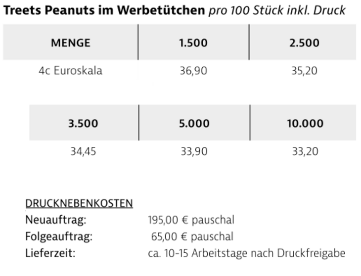 Preisliste Treets Peanuts im Werbetütchen mit Logo Details