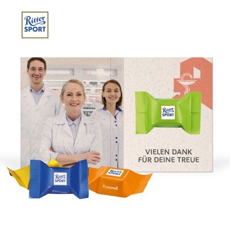 Süße Grüße mit optimaler Werbefläche! Süße Grußkarte mit viel Platz für Ihre individuelle Werbebotschaft. Wählen Sie Ihre Wunschfüllung aus einer Vielzahl beliebter Premium-Varianten. Der Werbeerfolg ist Ihnen damit sicher. Klimaneutrales Produkt, auf FSC®-zertifiziertem Karton aus nachhaltiger Forstwirtschaft und anderen kontrollierten Quellen. Das Lindt & Sprüngli Farming-Programm steht für nachhaltige Kakaobohnen-BeschaffungProduktdetails: Werbe-Klappkarte mit süßer FüllungBedruckung/Motive: 4-farbiger Druck auf grafischem Premium-Karton (FSC ® -zertifiziert). Optional auf Graspapier, Naturkarton oder Coffee-Cup-Paper.Format: ca. 90 x 70 x 11 mm (geschlossen)Inhalt: 1 Ritter SPORT Schokowürfel (8g)Lieferzeit/Zubehör: ca.15 Arbeitstage nach Druckfreigabe.Mindestbestellmenge: 250 Stück