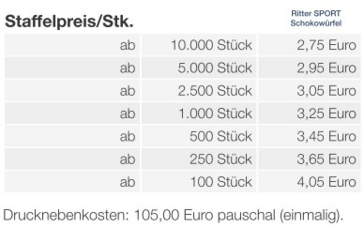 Preisliste Werbetasche mit süßer Füllung Ritter SPORT Schokowürfel mit Logo