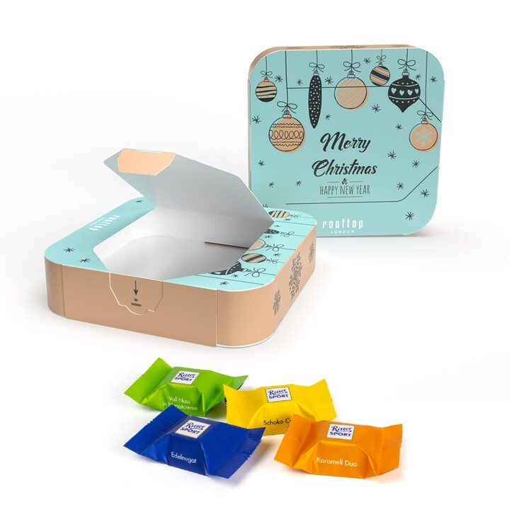 Die vielseitig befüllbare Appbox, gefüllt mit beliebten Ritter Sport Schokowürfeln in verschiedenen Sorten, ist aus reinem Papier hergestellt und ein echter Hingucker. Die Box kann vollflächig veredelt und die Füllung durch ein perforiertes Türchen entnommen werden. Second Life: Nach Gebrauch kann die Box mit kleinen Büroartikeln wie Heftklammern befüllt werden. Klimaneutral produziert.Füllung: (nur gemischt möglich) je 3 Ritter SPORT Schokowürfel in den Geschmacksrichtungen ; Edelnougat, Karamell Duo, Voll-Nuss in Nougatcreme und Schoko CrispGewicht: Inhalt 96 gVerpackungsmaß: ca. 134 x 134 x 32 mm (L x B x H)Verpackungseinheit: 24 Stück im KartonHaltbarkeit: 9 Monate bei sachgerechter LagerungLieferzeit: ca. 15-20 Arbeitstage nach DruckfreigabeMindestbestellmenge: 264 Stück