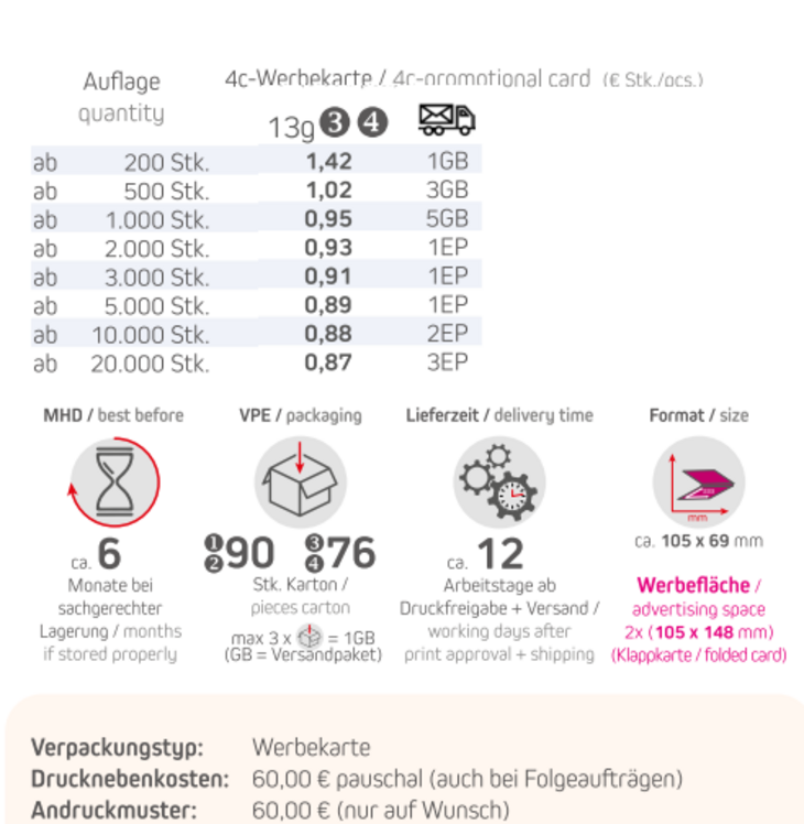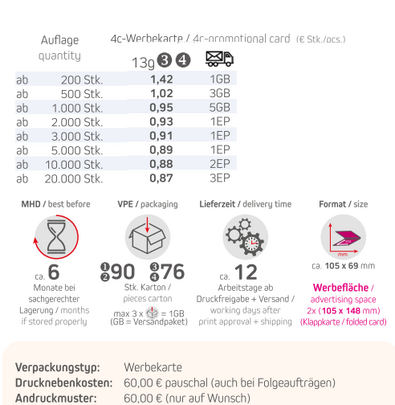 Inhalt: Schoko-Auto Mix 13gVerpackungstyp: WerbekarteFormat: ca. 105 x 69 mmWerbefläche: 4c-Werbekarte 105 x 148 mm Lieferzeit: ca. 12 Tag ab Druckfreigabe + VersandVPE: 90 Stk. / KartonHaltbarkeit: ca. 6 Monate bei sachgerechter LagerungMindestbestellmenge: 200 Stück