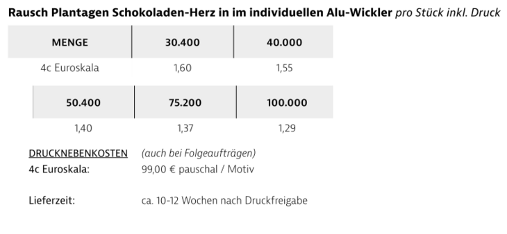 Preisliste Rausch Plantagen Schokoladen-Herz im individuellen Alu-Wickler mit Logo Details