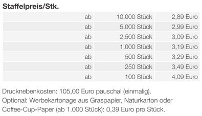 Milka: Im Herzen zart! Leckere zartschmelzende Schokolade aus 100 % Alpenmilch in einer individuell bedruckbaren Werbeverpackung.Produkt: Schokoladentafel von Milka in Originalverpackung, verpackt in einer individuellen Werbekartonage. Nachhaltigkeit: Klimaneutrales Produkt, gefertigt auf FSC ® -zertifiziertem Karton aus nachhaltiger Forstwirtschaft. .Bedruckung/Motive: 4-farbiger Druck auf grafischem Premium-Karton (FSC ® -zertifiziert). Optional auf Graspapier, Naturkarton oder Coffee-Cup-Paper.Inhalt: 1 Schokoladentafel 90g von MilkaMaße: ca. 180 x 78 x 12 mm.Geschmacksrichtungen: Alpenmilch oder Haselnuss.Haltbarkeit: 6 MonateVerpackung: 100 Stück pro Karton, 2.400 Stück pro Palette.Lieferzeit: Lieferung ca. 15 Arbeitstage nach Druckfreigabe.Gleich mitbestellen: Einzelversandkarton für den Postversand 0,59 Euro pro StückMindestbestellmenge: 100 Stück