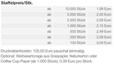 Alpenmilch-Schokolade mit Ihrer individuellen Werbebotschaft! Der beliebte Milka Genuss im handlichen Format – zarte Alpenmilch-Stückchen, die auf der Zunge schmelzen und pure Freude bereiten. Ob als aufmerksamkeitsstarkes Give-Away, als Dankeschön für Kunden oder als süße Beigabe im Mailing – diese kleine Tafel sorgt für große WirkungProdukt: Schokoladentafel von Milka, verpackt in einem individuellen WerbeschuberMaße: ca. 140 x 63 x 9 mmNachhaltigkeit: Für jede Bestellung mit uns wird ein Baum über GROW MY TREE gepflanzt. Wir verwenden FSC ® -zertifizierten Karton aus nachhaltiger Forstwirtschaft und anderen kontrollierten QuellenBedruckung/Motive: 4-farbiger Druck auf grafischem Premium-Karton (FSC ® -zertifiziert). Optional auf Graspapier, Naturkarton oder Coffee-Cup-PaperInhalt: 1 Schokoladentafel ca. 45g von Milka. Geschmacksrichtung: AlpenmilchVerpackung: 150 Stück pro Karton, 5.400 Stück pro PaletteHaltbarkeit: 6 MonateLieferzeit: ca. 10-15 Arbeitstage nach Druckfreigabe.Gleich mitbestellen: Einzelversandkarton für den Postversand: 0,59 Euro pro StückMindestbestellmenge: 100 Stück