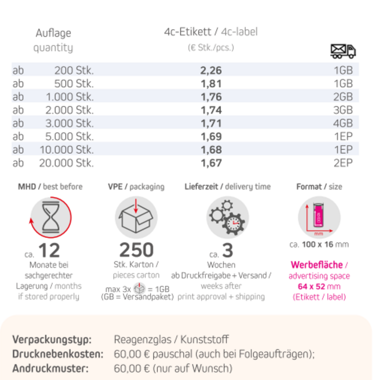 Produkt: Reagenzglas / KunststoffInhalt: Bunte Schokolinsen 10 gFormat: ca. 100 x 16 mmWerbefläche: 4c-Etikett 64 x 52 mm Lieferzeit: ca. 3 Wochen ab Druckfreigabe + VersandVPE: 250 Stk. / KartonHaltbarkeit: ca. 12 Monate bei sachgerechter LagerungMindestbestellmenge: 200 Stück Inhalt:Zutaten Schokolinsen: Vollmilchpulver, Kakaobutter, Kakaomasse, Molkenpulver, Maissirup, Rohrzucker, Reisstärke, Frucht- und Pflanzenextrakte, Lecithin.