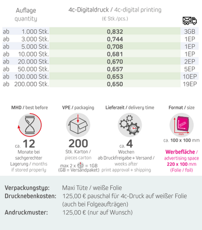 Verpackungstyp: Maxi-Tüte / weiße FolieInhalt: Bio Kräuter Croutons 10gFormat: ca. 100 x 100 mmDruckart: 4c-DigitaldruckWerbefläche: 220 x 100 mmVerpackung: 200 Stück / KartonLieferzeit: ca. 4 Wochen ab Druckfreigabe + VersandMindestmenge: 1000 Stk.Haltbarkeit: ca. 12 Monate bei sachgerechter Lagerung