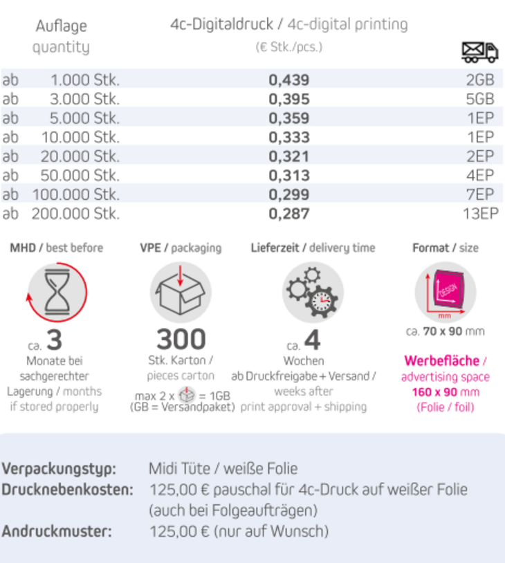 Verpackungstyp: Midi Tüte / weißer FolieInhalt: ca. 10g Erdnüsse gesalzeneFormat: ca. 70 x 90 mmDruck: 4c- Digitaldruck Werbefläche: 160 mm x 90 mmHaltbarkeit: ca. 10 Monate bei sachgerechter LagerungVerpackung: 300 Stück / KartonLieferzeit: ca. 4 Wochen ab Druckfreigabe + VersandMindestbestellmenge: 1.000 Stück