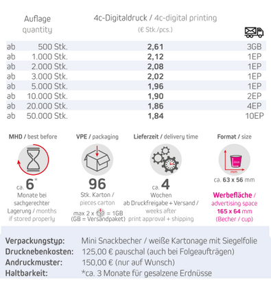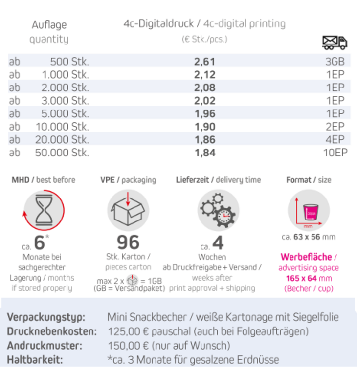 Produkt: Mini Snackbecher / weiße Kartonage mit SiegelfolieInhalt: 30 g - 40g Erdnüsse je nach SorteSorten: 40g gesalzen (Art.-Nr. MF-NB-00121), 30g Barbecue (Art.-Nr. 00117), 30g Wasabi (Art.-Nr. 00120), 30g Paprika (Art.-Nr. 00119), 30g Chili (Art.-Nr. 01993)Format: ca. 63 x 56 mmDruck: 4c-DigitaldruckWerbefläche: 165 x 64 mmLieferzeit: ca. 4 Wochen ab Druckfreigabe + VersandVPE: 96 Stk. / KartonHaltbarkeit: ca. 3 Monate für gesalzene Erdnüsse und andere Sorten ca. 6 Monate bei sachgerechter LagerungMindestbestellmenge: 500 Stück