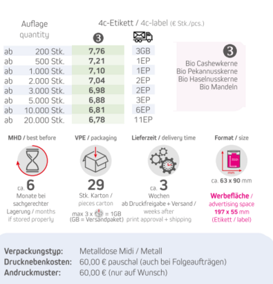 Verpackungstyp: Metalldose Midi / MetallFarbe: silber (02390) oder schwarz (02393)Inhalt: Bio NusskernMix 100gFormat ca. 63 x 90 mmWerbefläche: 4c-Etikett 197 x 55 mmDruck: DigitaldruckLieferzeit: ca. 3 Wochen ab Druckfreigabe + VersandVPE: 29 Stk. / KartonHaltbarkeit: ca. 6 Monate bei sachgerechter LagerungMindestbestellmenge: 200 Stück