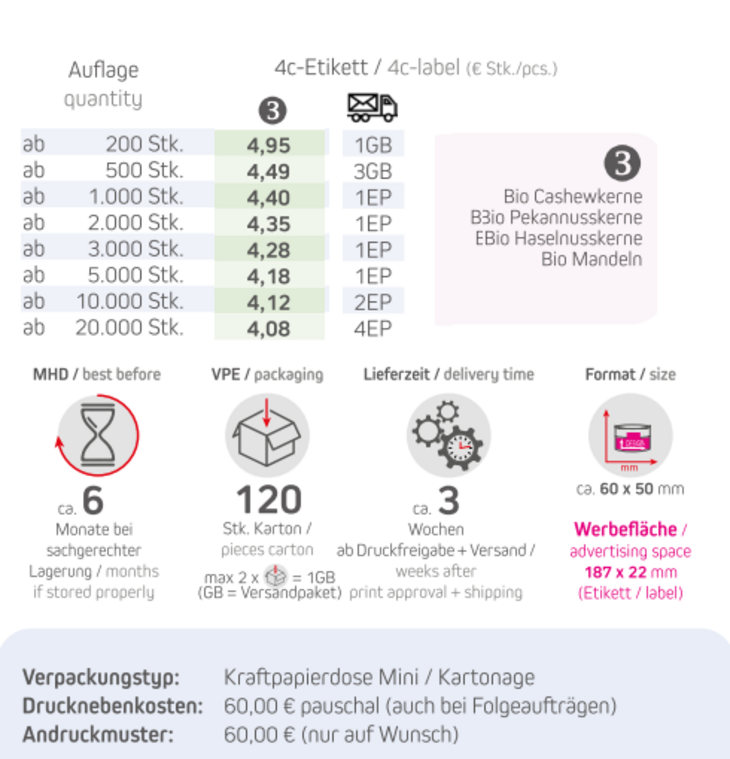 Verpackungstyp: Kraftpapierdose Mini / KartonageInhalt: Bio NusskernMix 40gFormat ca. 60 x 50 mmWerbefläche: 4c-Etikett 187 x 22 mmDruck: DigitaldruckLieferzeit: ca. 3 Wochen ab Druckfreigabe + VersandVPE: 120 Stk. / KartonHaltbarkeit: ca. 6 Monate bei sachgerechter LagerungMindestbestellmenge: 200 Stück
