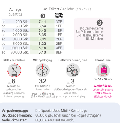 Preisliste Bio NusskernMix 80g Biologisch abbaubare Eco Pappdose Midi braun mit Logo Details