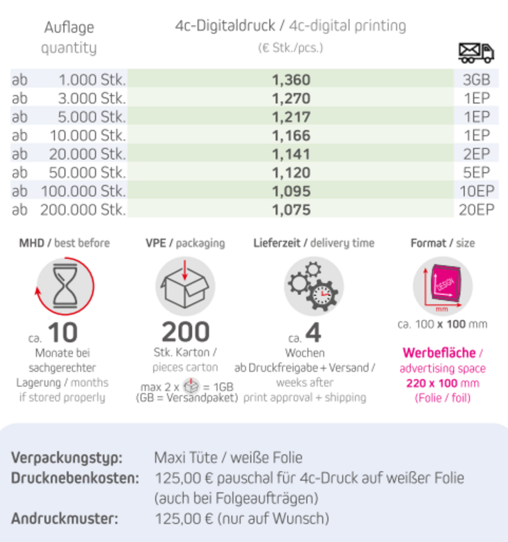 Produkt: Maxi Tüte / weiße FolieInhalt: 30g Bio StudentenfutterFormat: ca. 100 x 100 mmDruck: 4c-DigitaldruckWerbefläche: 220 x 100 mmLieferzeit: ca. 4 Wochen ab Druckfreigabe + VersandVPE: 200 Stk. / KartonHaltbarkeit: ca. 10 Monate bei sachgerechter LagerungMindestbestellmenge: 1.000 Stück