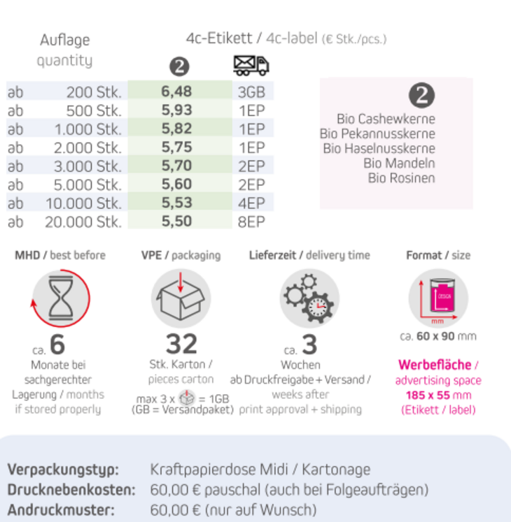 Produkt: Biologisch abbaubare Eco Pappdose Midi braunInhalt: 80g Bio Studentenfutter Format: ca. 60 x 90 mmDruck: DigitaldruckWerbefläche: 4c-Etikett 185 x 55 mmLieferzeit: ca. 3 Wochen ab Druckfreigabe + VersandVPE: 32 Stk. / KartonHaltbarkeit: ca. 6 Monate bei sachgerechter LagerungMindestbestellmenge: 200 Stück