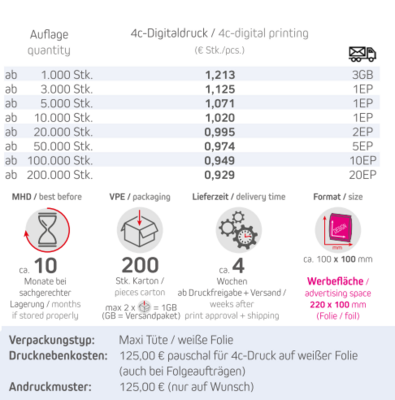 Inhalt: Premium Studentenfutter 30gVerpackungstyp: Maxi-Tüte/weiße FolieFormat: ca. 100 x 100 mmDruck: 4c-DigitaldruckWerbefläche: 220 x 90 mmVerpackung: 200 Stück / KartonLieferzeit: ca. 4 Wochen ab Druckfreigabe + VersandMindestmenge: 1000 Stk.Haltbarkeit: ca. 10 Monate bei sachgerechter Lagerung