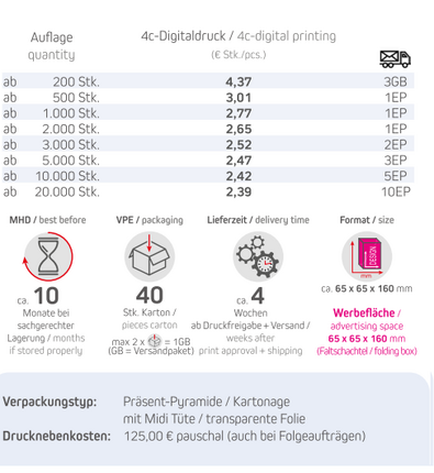 Produkt: Präsent-Pyramide / Kartonage Inhalt: Veganes Premium Studentenfutter 30 gFormat: ca. 65 x 65 x 160 mmDruck: 4c-DigitaldruckWerbefläche: 294 x 232 mm Lieferzeit: ca. 4 Wochen ab Druckfreigabe + VersandVPE: 40 Stk. / KartonHaltbarkeit: ca. 10 Monate bei sachgerechter LagerungMindestbestellmenge: 200 Stück