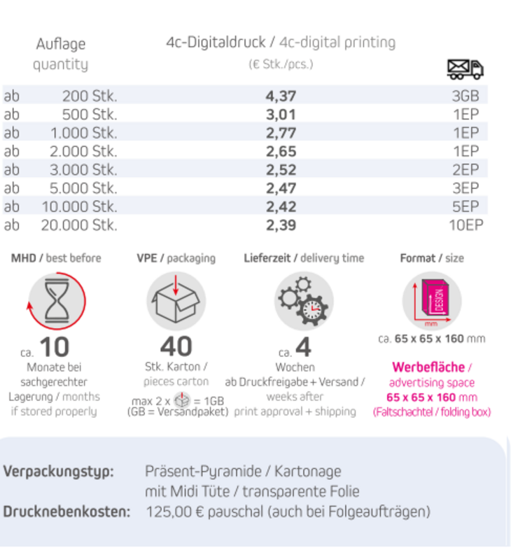 Preisliste Premium Studentenfutter 30g Präsent-Pyramide mit Logo Details