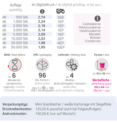 Produkt: Mini Snackbecher / weiße Kartonage mit SiegelfolieInhalt: 40 g Premium StudentenfutterFormat: ca. 63 x 56 mmDruck: 4c-DigitaldruckWerbefläche: 165 x 64 mmLieferzeit: ca. 4 Wochen ab Druckfreigabe + VersandVPE: 96 Stk. / KartonHaltbarkeit: ca. 6 Monate bei sachgerechter LagerungMindestbestellmenge: 500 Stück