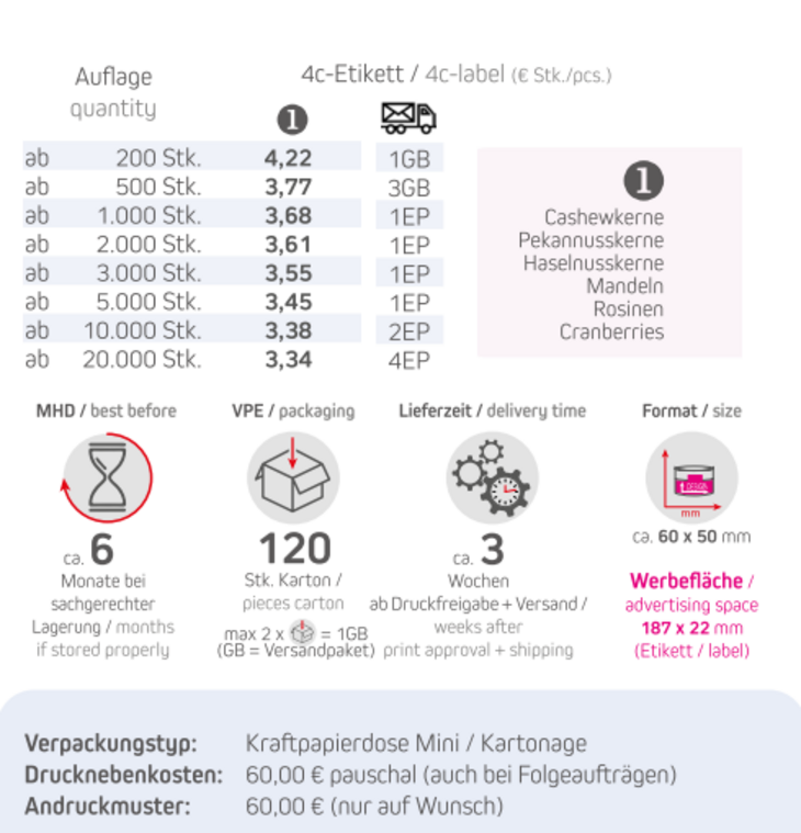 Verpackungstyp: Kraftpapierdose schwarz Mini / KartonageInhalt: Premium Studentenfutter 40gFormat ca. 60 x 50 mmDruck: 4c-Etikett- und DigitaldruckWerbefläche: 187 x 22 mmLieferzeit: ca. 3 Wochen ab Druckfreigabe + VersandVPE: 120 Stk. / KartonHaltbarkeit: ca. 6 Monate bei sachgerechter LagerungMindestbestellmenge: 200 Stück