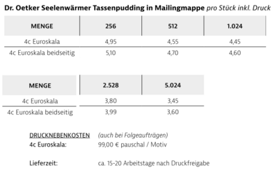 Preisliste Dr. Oetker Tassenpudding in Mailingmappe mit Logo Details