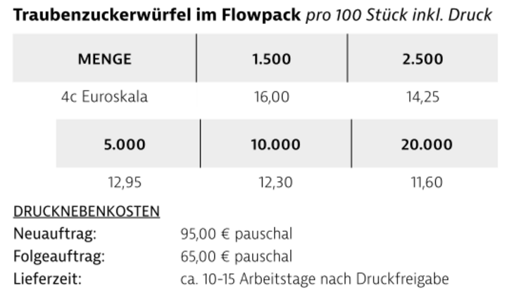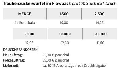 Preisliste Traubenzuckerwürfel im Flowpack mit Logo