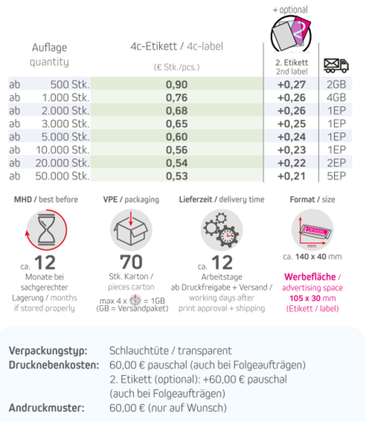 Produkt: Schlauchtüte / transparentInhalt: Bio Wassereis, 30mlSorten: Apfel, Kirsche, Cola, Exotic, ZitroneFormat: ca. 140 x 40 mmWerbefläche: 4c-Etikett 105 x 30 mmOptional: 2. Etikett möglich!Lieferzeit: ca. 12 Arbeitstage ab Druckfreigabe + VersandVPE: 70 Stk. / KartonHaltbarkeit: ca. 12 Monate bei sachgerechter LagerungMindestbestellmenge: 500 Stück