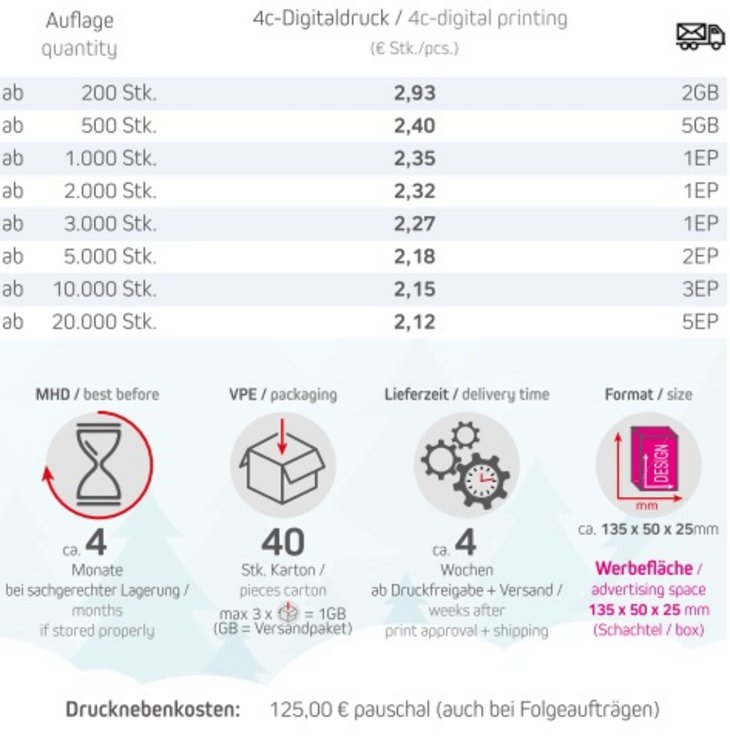 Ein Klassiker, der verführt: Unsere Dominosteine in edler Zartbitter-Schokolade sind ein wahres Geschmackserlebnis. Der weiche Lebkuchenboden, gefüllt mit fruchtiger Geleeschicht und umhüllt von feinster Zartbitter-Schokolade, macht jedes Stück zu einer kleinen Auszeit im Advent. Verleihen Sie Ihrer Weihnachtswerbung einen besonders eleganten Touch und verschenken Sie diese Leckerei als süßes Giveaway – für unvergessliche Momente und bleibende Eindrücke!