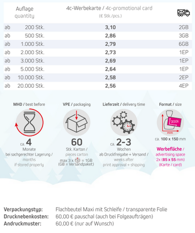 Zutaten: 84% weiße Schokolade (Zucker, Kakaobutter, Vollmilchpulver, Molkenpulver, Emulgator: Sojalecithin, natürliches Vanillearoma), 10% schwarze Johannisbeeren, 2% Johannisbeerpulver, Überzugsmittel: Glukosesirup, Emulgator: Gummi arabicum, Joghurtpulver, Joghurtaroma, Überzugsmittel: Schellack.Haltbarkeit: ca. 4 Monate bei sachgerechter LagerungNetto-Gewicht: ca. 30gVerpackungstyp: kompostierbarer Flachbeutel mit WerbekarteFormat: ca. 150 x 80 mmWerbefläche: Werbekarte doppelseitig 85 x 55 mmLieferzeit: ca. 2-3 Wochen ab Druckfreigabe + VersandDruckart: DigitaldruckMindestmenge: 200 Stk.
