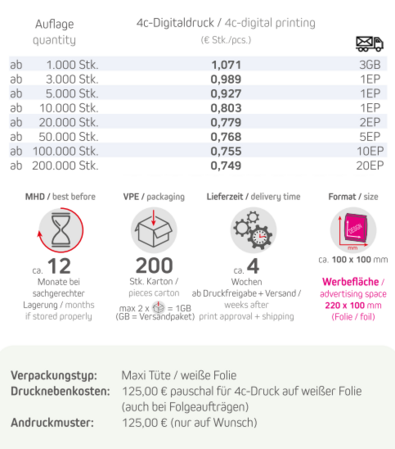 Verpackungstyp: Maxi-Tüte / weiße FolieInhalt: 30g Gummibärchen zuckerfreiFormat: ca. 100 x 100 mmWerbefläche: 220 x 100 mmLieferzeit: ca. 4 Arbeitswochen ab Druckfreigabe + VersandDruckart: 4c-DigitaldruckVPE: 200 Stück / KartonMindestmenge: 1.000 Stk.Haltbarkeit: ca. 12 Monate bei sachgerechter Lagerung