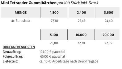Preisliste Mini Tetraeder Gummibärchen mit Logo Details