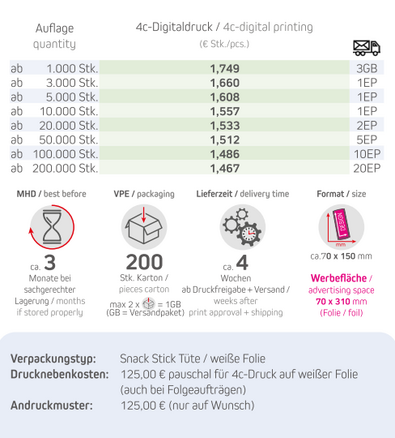 Produkt: Snack Stick Tüte / weiße FolieInhalt: Bio Cashewkerne geröstet gesalzen 30gFormat: ca. 150 x 70 x 20 mmDruck: 4c DigitaldruckWerbefläche: 70 x 310 mmLieferzeit: ca. 4 Wochen ab Druckfreigabe + VersandVPE: 200 Stk. / KartonHaltbarkeit: ca. 3 Monate bei sachgerechter LagerungMindestbestellmenge: 1000 StückInhalt:Zutaten Bio Cashewkerne geröstet gesalzen: Cashewkerne geröstet* 98,1%, Salz 1,5%, Kokosöl* 0,4%. *aus kontrolliert biologischem Anbau