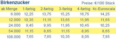 Inhalt ca. 4 g BirkenzuckerAusführung weiße PapierverbundfolieFormate Rechteckbeutel 60 x 50 mm;50 x 75 mmStick 17 x 100 mmTetraeder 30 x 50 mmVerpackung Kartons à 1.000 StückHaltbarkeit 24 Monate bei sachgerechter LagerungLieferzeit ca. 15 Arbeitstage nach Druckfreigabe