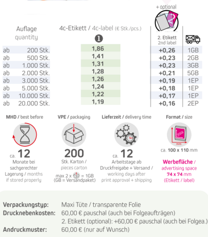 Produkt: Maxi Tüte / transparente FolieInhalt: Vegane Bio Gummibärchen ohne Gelantine 30gFormat: ca. 100 x 110 mmDruck: Digitaldruck Optinal: 2. Etikett möglich!Werbefläche: 4c-Etikett 74 x 74 mm Lieferzeit: ca.12 Arbeitstage ab Druckfreigabe + Express VersandVPE: 200 Stk. / KartonHaltbarkeit: ca. 12 Monate bei sachgerechter LagerungMindestbestellmenge: 200 Stück