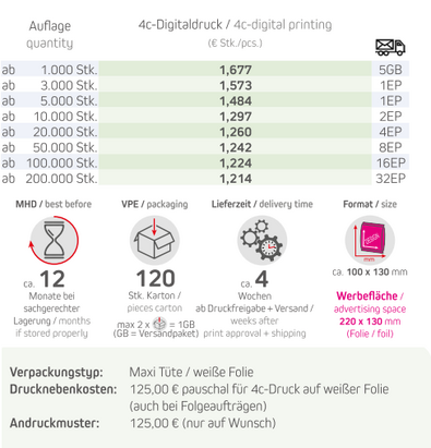 Verpackungstyp: Maxi-Tüte / weiße FolieInhalt: Bio Gummibärchen ohne Gelatine 50gFormat: ca. 100 x 130 mmDruckart: 4c-DigitaldruckWerbefläche: 220 x 130 mmLieferzeit: ca. 4 Arbeitswochen ab Druckfreigabe + VersandVPE: 120 Stück / KartonMindestmenge: 1.000 Stk.Haltbarkeit: ca. 12 Monate bei sachgerechter Lagerung