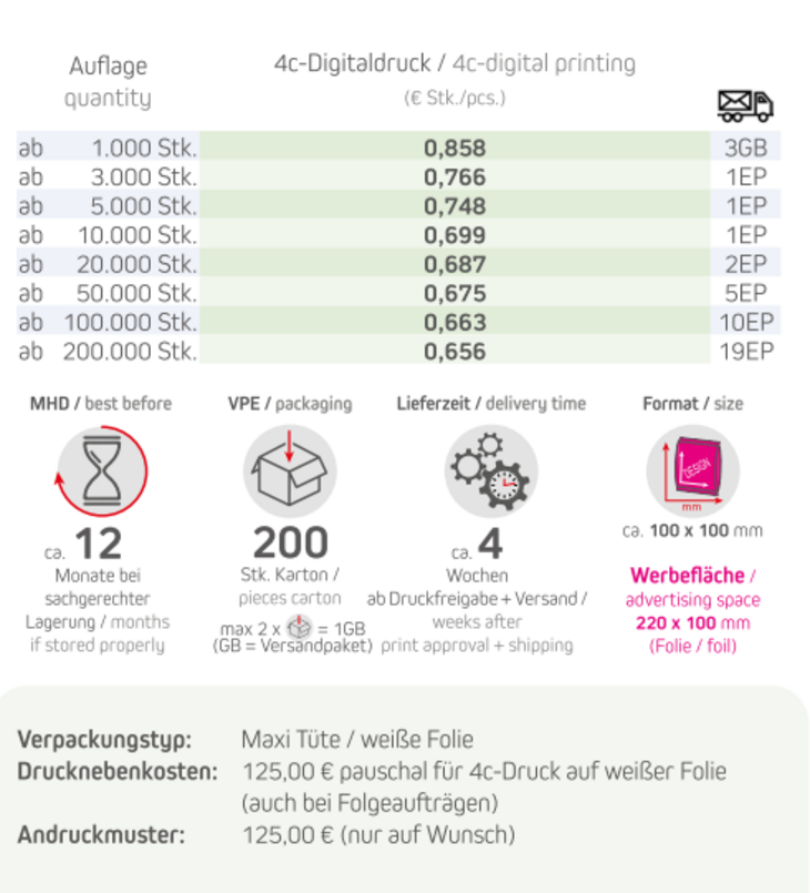 Produkt: Midi Tüte / weiße FolieInhalt: 20g Bio Wine Gums ohne Gelatine (vegan)Format: ca. 100 x 100 mmDruckart: 4c-DigitaldruckWerbefläche: 220 x 100 mmLieferzeit: ca. 4 Wochen ab Druckfreigabe + VersandVPE: 200 Stk. / KartonHaltbarkeit: ca. 12 Monate bei sachgerechter LagerungMindestbestellmenge: 1.000 Stück