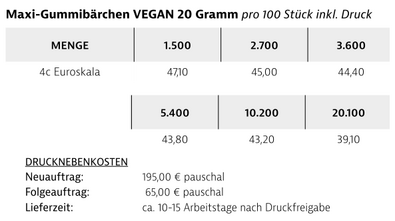 Preisliste Gummibärchen vegan 20g mit Logo Details