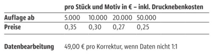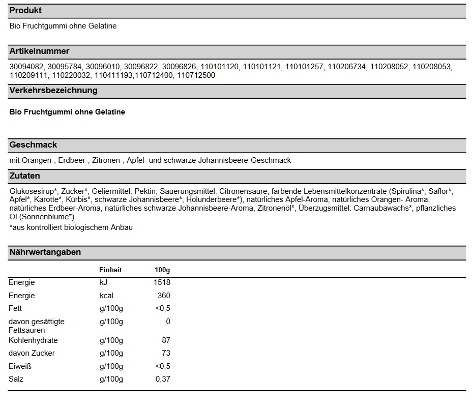 Vegane Bio*-Bärchen aus kontrolliert biologischen Zutaten, ohne Gelatine, mit natürlichen Aromen und färbenden Lebensmittelkonzentraten, farblich und geschmacklich bunt gemischt, im Werbetütchen verpackt. Ab 320 kg sind alle Standardformen möglich. * BIO zertifiziert nach DE-ÖKO-007Inhalt: ca. 10g vegane Bio Premium-BärchenWerbetütchen: konventionelle, glänzend- oder matt-kaschierte Folien & FarbenMindesthaltbarkeit: 9 Monate Format: ca. 85 x 60 mm Verpackung: 500 Stück / KartonLieferzeit: ca. 15 Arbeitstage nach DruckfreigabeMindestbestellmenge: 5.000 Stück